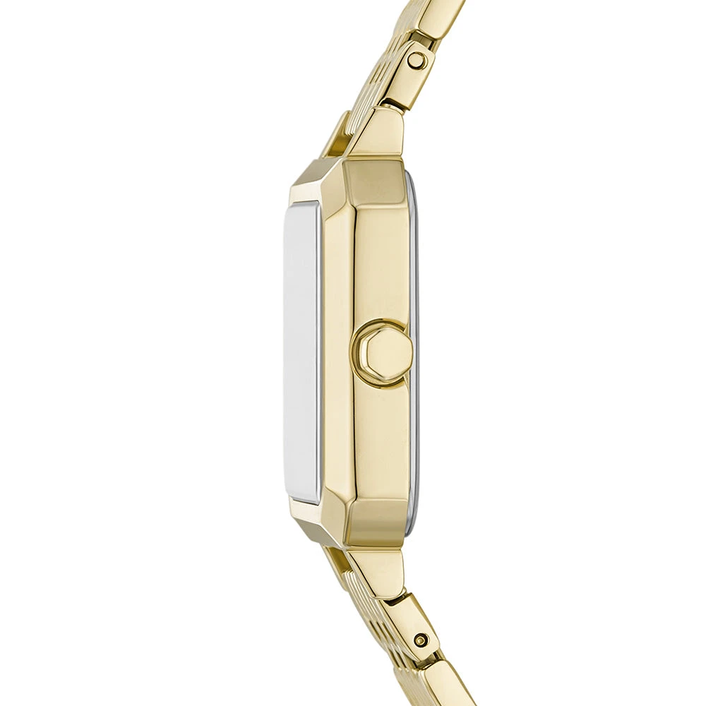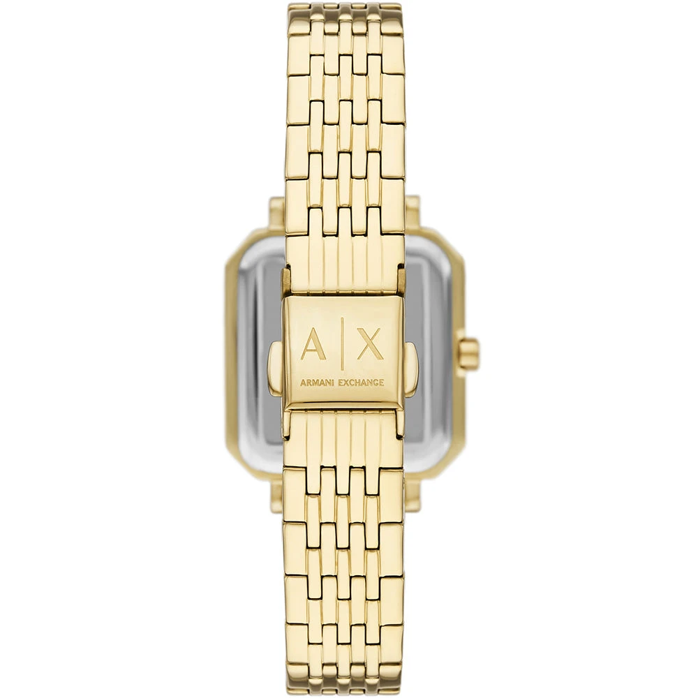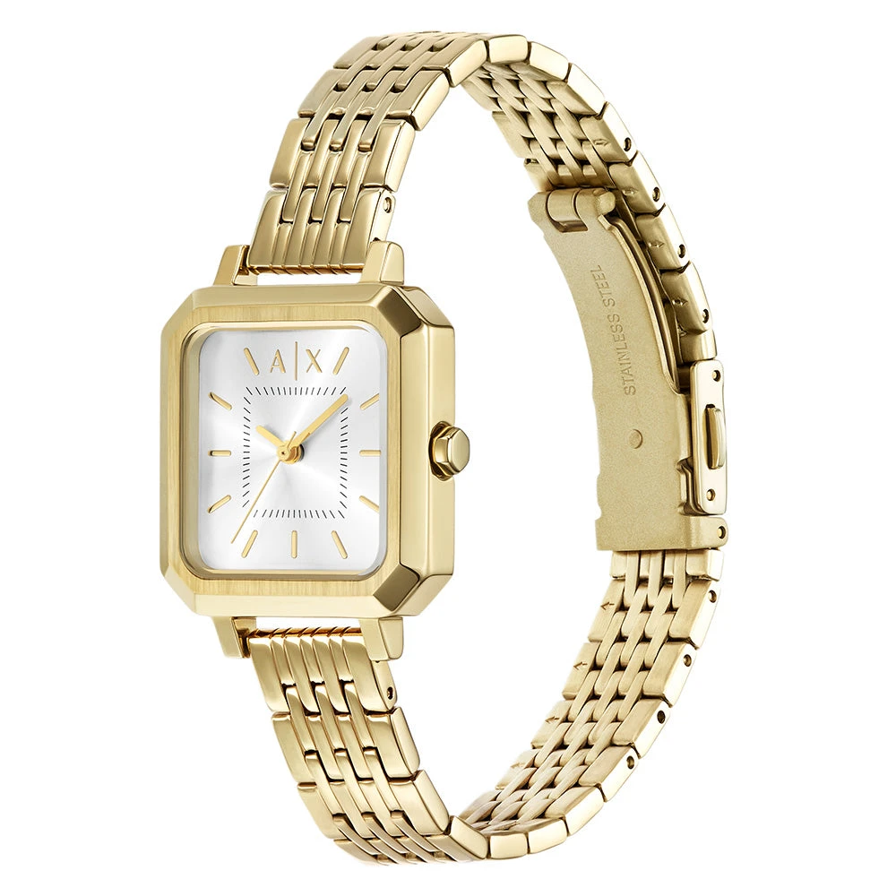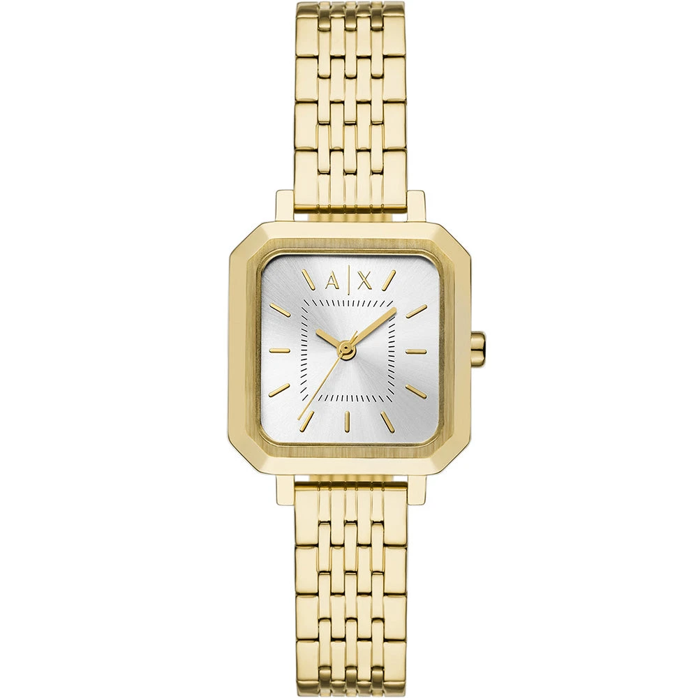 Introducing the Armani Exchange Leila AX4725, a timeless expression of sophistication and luxury. This elegant timepiece features a radiant gold-tone stainless steel case and bracelet, complemented by a captivating silver dial adorned with matching gold accents. Powered by precise quartz three-hand movement, it ensures accurate timekeeping with effortless style. The 27mm case size offers a delicate and refined presence on the wrist, enhanced by the durability and comfort of its stainless-steel band. Protected by a scratch-resistant mineral crystal, the AX4725 maintains clarity and resilience against daily wear. With water resistance up to 50 meters, it seamlessly blends practicality with refined aesthetics, making it an ideal accessory for both everyday elegance and special occasions.