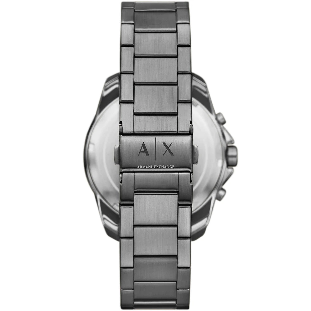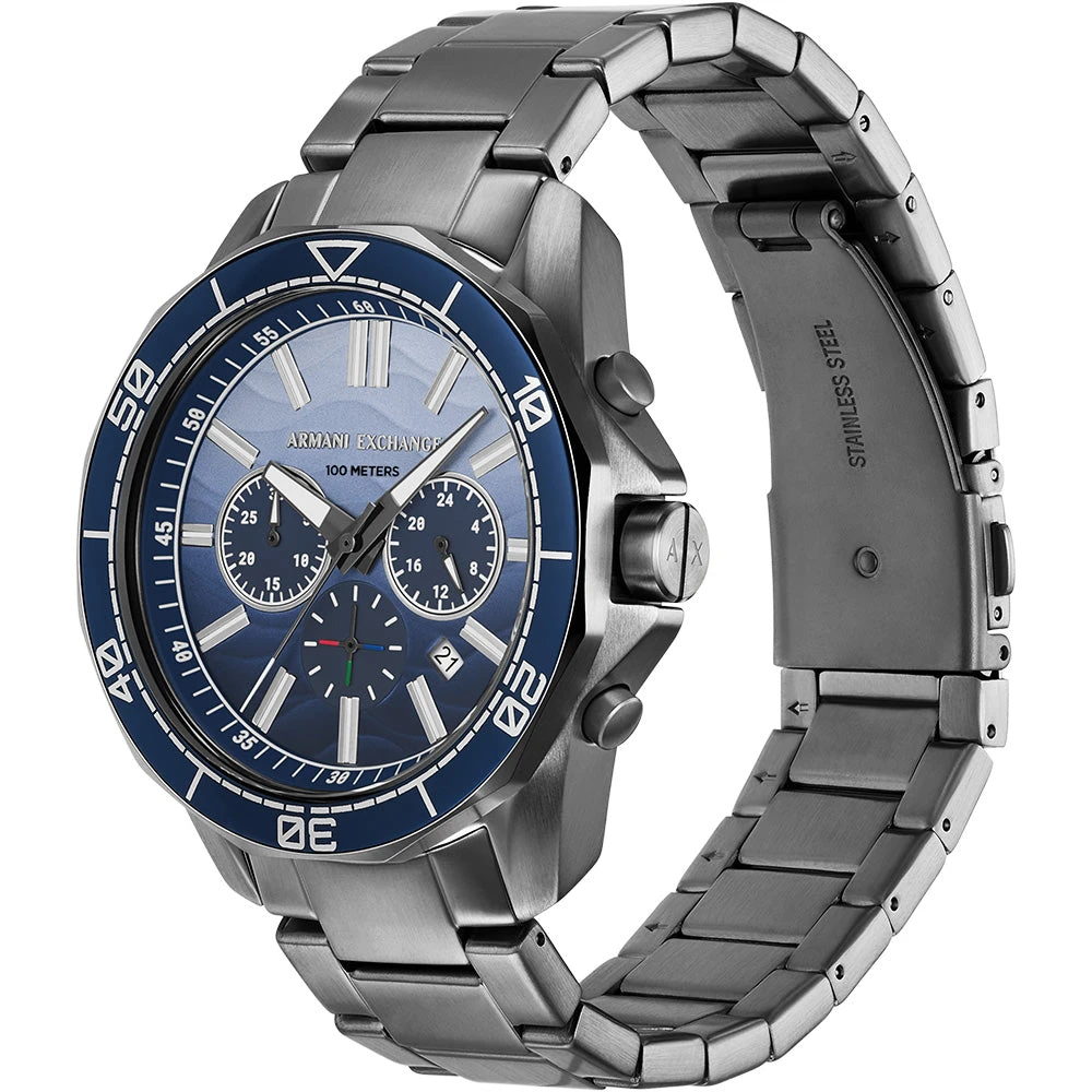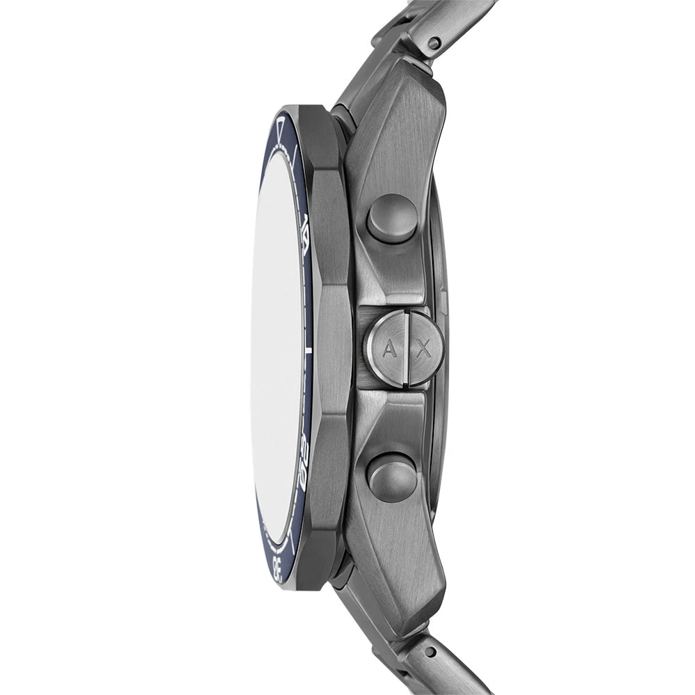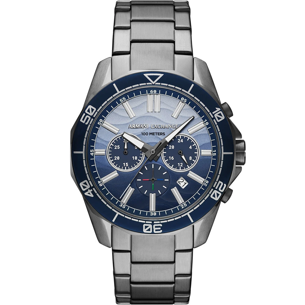 The Armani Exchange Spencer AX1967 Chronograph is a bold fusion of modern design and sporty function. Its standout feature is the blue-to-white gradient wave dial, creating dynamic visual depth beneath a sleek grey gunmetal stainless-steel case. Paired with a matching bracelet and chronograph sub-dials, this watch makes a powerful style statement.