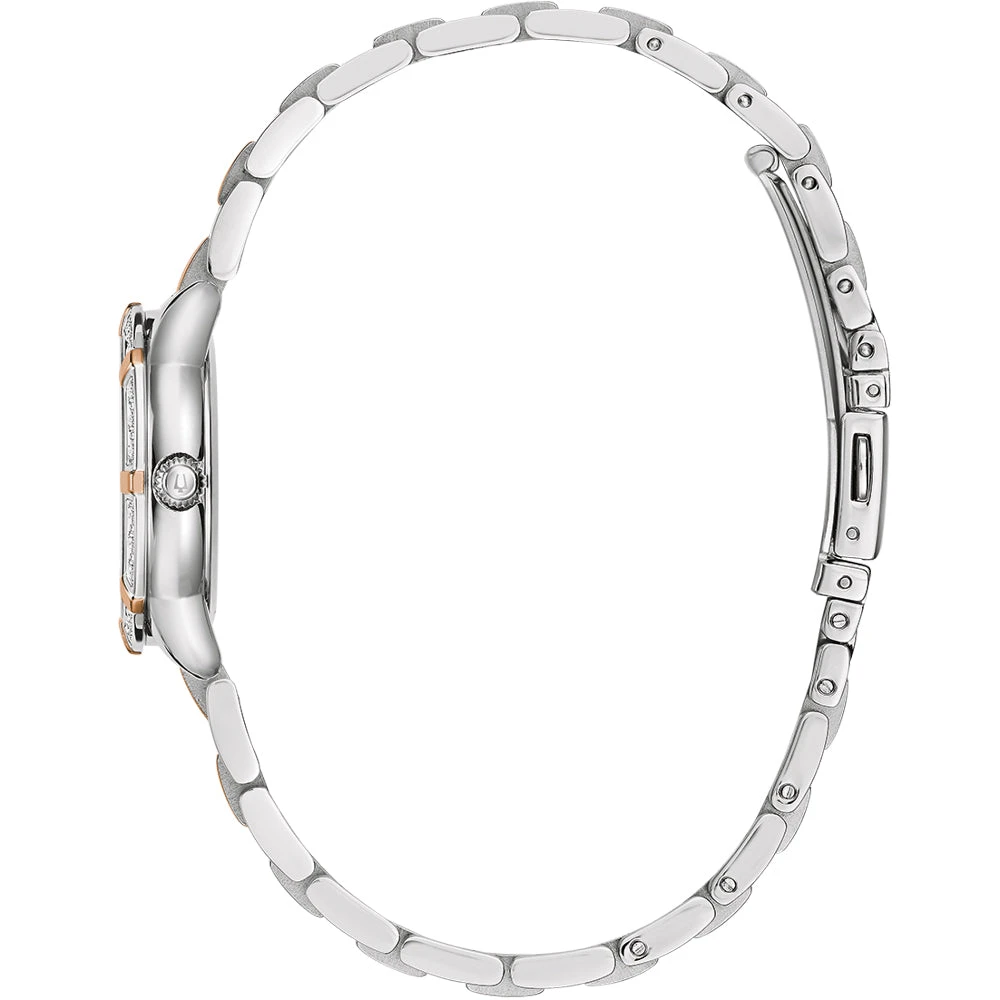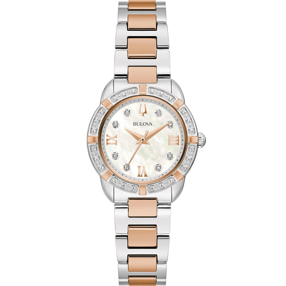 From Bulova’s Classic Collection, the 98R291 Diamond timepiece showcases a two-tone rose gold and stainless-steel case. The elegant white mother-of-pearl dial is adorned with 8 diamonds and enhanced by rose gold-tone markers and hands. The bezel is further embellished with 24 diamonds, while flat mineral glass provides clarity. The watch features a 27mm case, quartz movement, and is paired with a two-tone bracelet featuring a short fold-over double-push closure. With water resistance up to 30 meters, it seamlessly blends luxury with practicality.