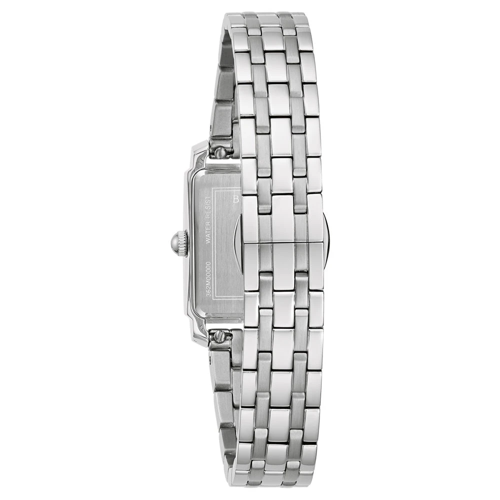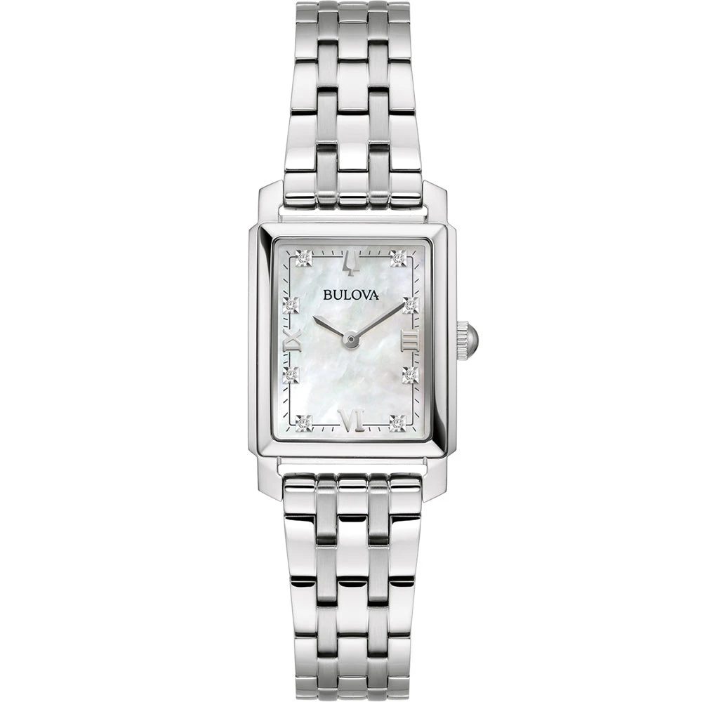 Introducing the Bulova Classic Diamond 96P244, a captivating addition to the timeless elegance of the Bulova Classic collection. This model boasts a petite 21mm rectangular stainless-steel case and matching bracelet, showcasing an exquisite mother-of-pearl dial adorned with eight dazzling diamond markers that exude sophistication and timeless brilliance.
