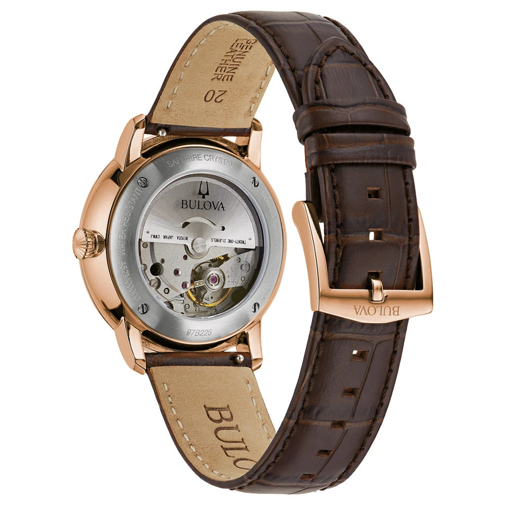 Powered by a 21-jewel automatic movement with a 42-hour power reserve, this timepiece blends form and function. A brown leather strap with quick-release spring bars and a 3-piece buckle offers both style and comfort.