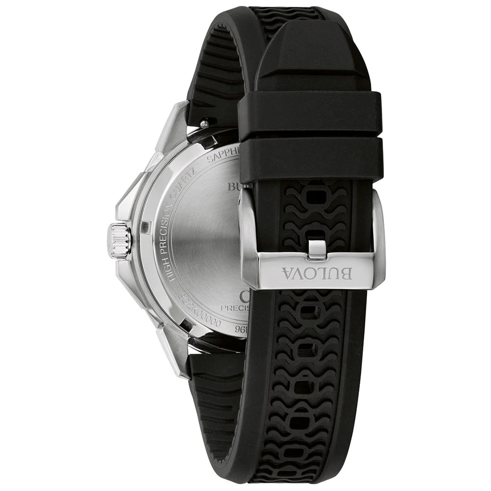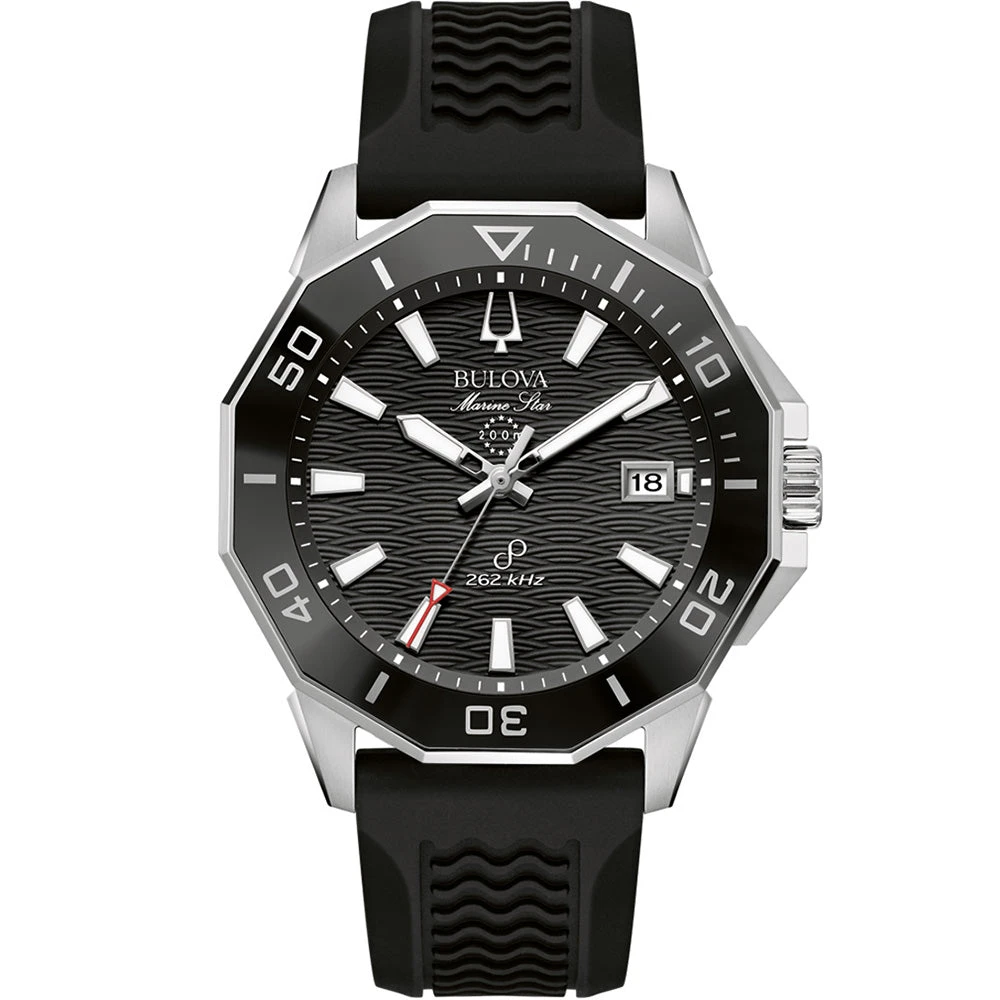 The watch is completed with a durable silicone strap and a pin buckle closure, making it the perfect timepiece for everything from daily wear to aquatic adventures. The Bulova Marine Star Precisionist is designed to handle it all with precision and style.