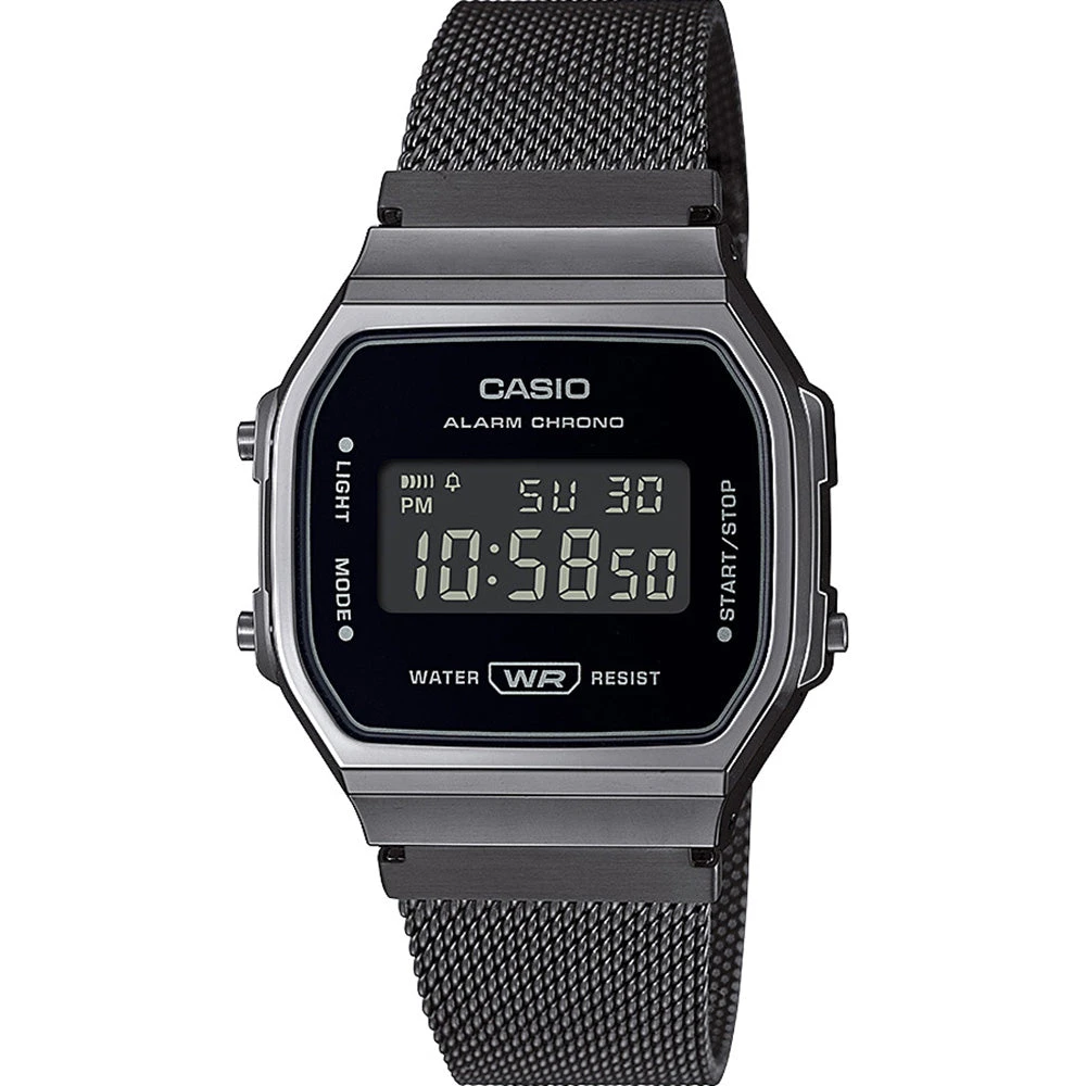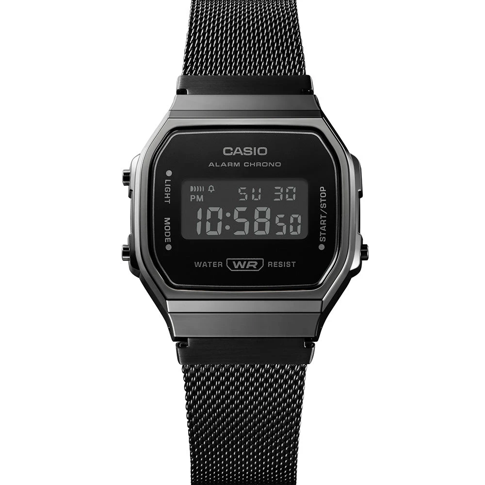 Go retro with this Casio A168WEMB-1B A168 One Tone Black Mesh Digital Watch that features a gunmetal case and a black ion-plated mesh band. More than just a fashion statement, this watch delivers useful functions such as a stopwatch and alarm, water resistance and an easy-to-read digital display. Go for monochromatic minimalism in a bold, boxy look that is especially versatile. You can’t go past this striking Casio watch.