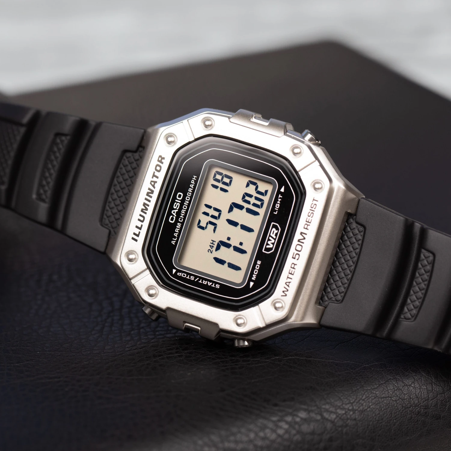 The Casio W218HM-7A Illuminator Digital watch blends practical functionality with a bold, sporty design. Featuring a silver resin case and bezel paired with a black strap, this watch offers a clear digital display that’s easy to read in any lighting, thanks to the built-in LED backlight.