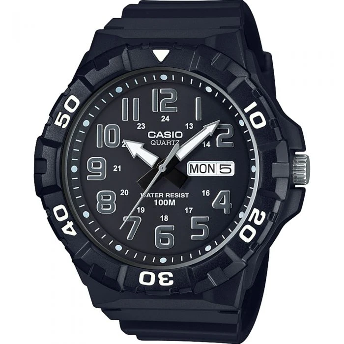 Introducing the Casio MRW210H-1A Black Resin Watch, featuring a bold 55 × 52.6 × 14.2mm case and weighing 61g for a substantial yet comfortable feel. Crafted with durable resin for the band, bezel, and case, it ensures reliability even in rugged environments. With water resistance up to 100 meters, it’s suitable for swimming and water sports. Powered by an SR927SW battery, it offers a battery life of approximately 3 years. The watch features resin glass for clear visibility and a practical timer bezel. It maintains an accuracy of ±20 seconds per month. Regular timekeeping is provided through analogue hands for hour, minute, and second, along with day and date displays for added convenience.