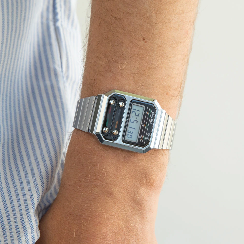 Embrace your love for technology with this stylish timepiece from the Casio Vintage collection, designed for all genders. The A100 series pays tribute to the F‐100, Casio’s pioneering watch featuring a resin case. While retaining the iconic layout with four front buttons, we’ve incorporated vintage-style metallic elements, giving it a modern twist. Retro in appearance yet loaded with modern features, these watches come equipped with a stopwatch, calendar, and water resistance for everyday wear. Plus, an LED light ensures clear visibility in any lighting conditions. Adjust the band length effortlessly with the slide clasp for a perfect fit every time.