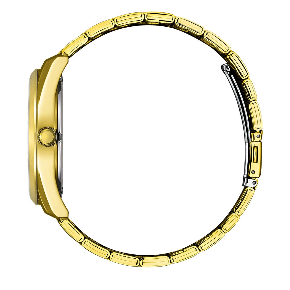 Designed with sleek gold tones and a captivating midnight blue dial, this Quartz-powered watch embodies a harmonious combination of timeless aesthetics and refined construction. Crafted from stainless steel and mineral glass, and boasting a 3-year battery life and WR100/10bar water resistance, it ensures dependability under pressure. Moreover, equipped with a push-button buckle and date display, it seamlessly integrates comfort and convenience, culminating in a perfectly balanced timepiece.
