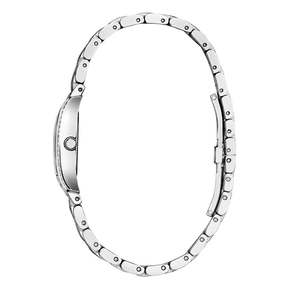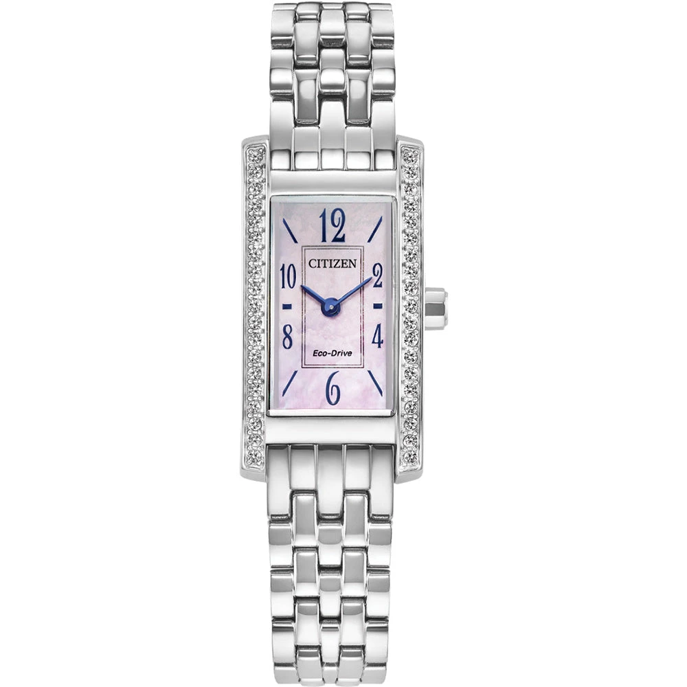 The Citizen Eco-Drive EG7110-54Y, part of the Petite Palidoro reissue, captures timeless elegance with a modern edge. Featuring a sleek 28mm silver-tone stainless steel case and bracelet, this refined timepiece is adorned with sparkling crystals on either side of the bezel and a distinctive geometric crown—adding a touch of Art Deco glamour. The pink mother-of-pearl dial enhances its graceful charm, while Citizen’s Eco-Drive technology powers the watch using any light source, eliminating the need for battery changes.