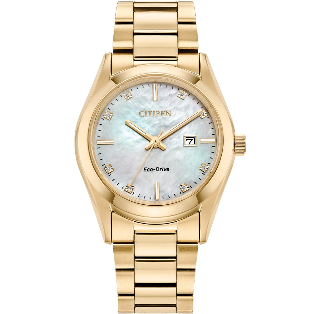 Capture those enduring moments in style with this timeless timepiece. Elevate your look with this elegant watch, showcasing a mother-of-pearl dial, gold-tone hands, and diamond-set markers set against a brushed gold-tone stainless-steel case and bracelet adorned with coordinating crystals. Further enhancing its appeal are features like Eco-Drive technology, mineral glass, and water resistance up to 50 meters.