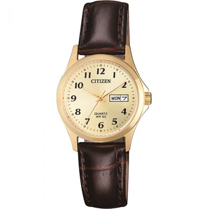 Infused with an air of distinction, this Quartz-powered timepiece infuses classic vintage aesthetics with a modern twist. Exemplifying understated grace, it boasts a luxuriously comfortable brown ox hide leather band, complemented by a gold-plated case and bezel, and a stunning brushed gold face. Driven by a Quartz mechanism and offering WR50/5bar water resistance, along with an accuracy of within 20 seconds per month, it is meticulously crafted to instill confidence through unwavering reliability.