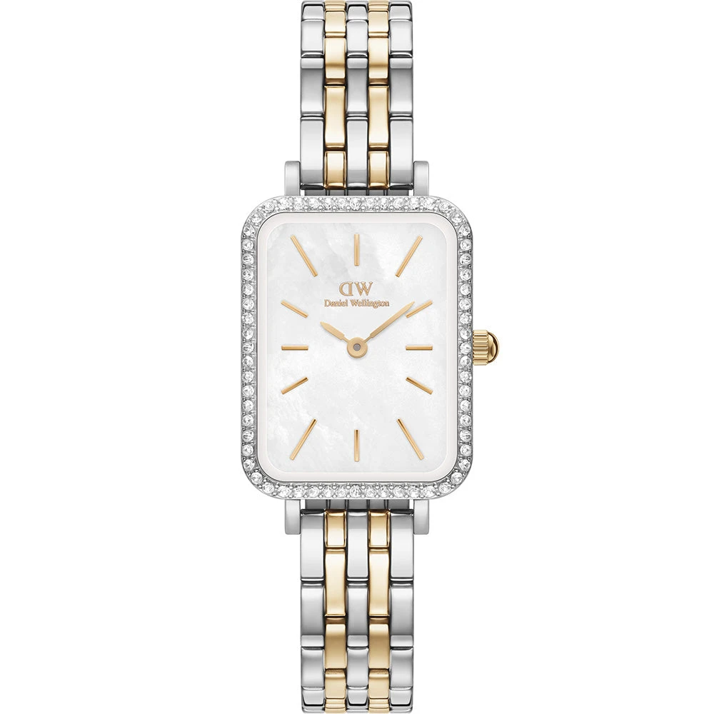 The Daniel Wellington DW00100671 Quadro epitomizes elegance with its refined design. Featuring a sleek silver rectangular case, this watch beautifully frames a shimmering Mother of Pearl dial. The 20x26mm double-plated stainless-steel case is complemented by a sophisticated two-tone gold and silver 5-link bracelet, creating a striking and versatile look. Powered by precise Japanese quartz movement and with 30 meters of water resistance, the Quadro blends timeless style with practical functionality.