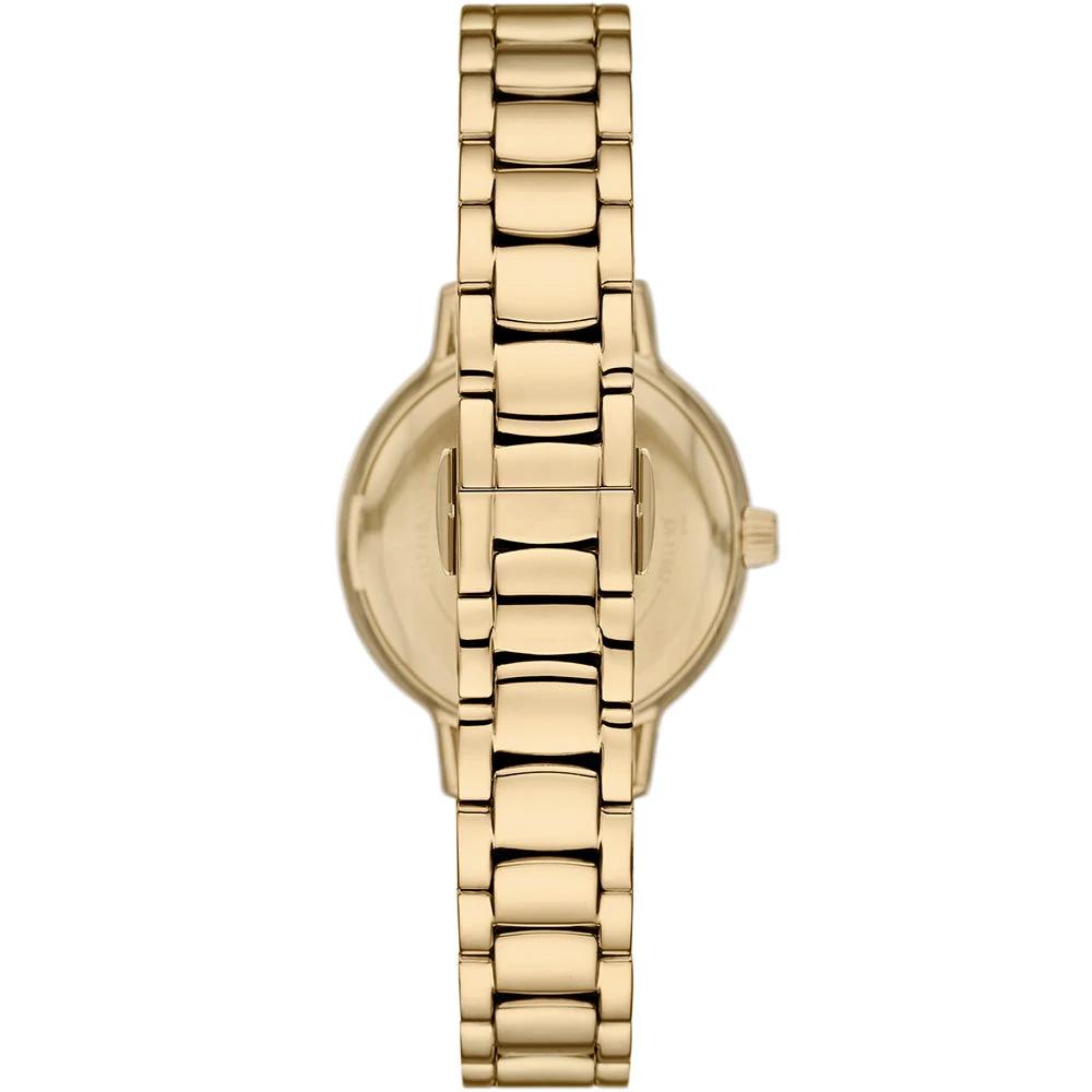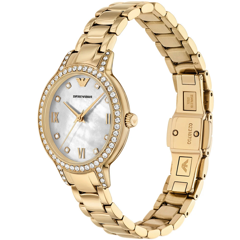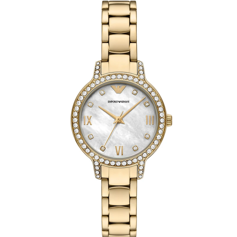 The Emporio Armani Cleo AR11652 is a refined and feminine timepiece that radiates elegance. Featuring a 32mm gold-tone stainless steel case with a crystal-set bezel, it frames a lustrous white mother-of-pearl dial for a luxurious touch. Paired with a matching gold bracelet, this watch is the perfect blend of timeless beauty and modern sophistication.