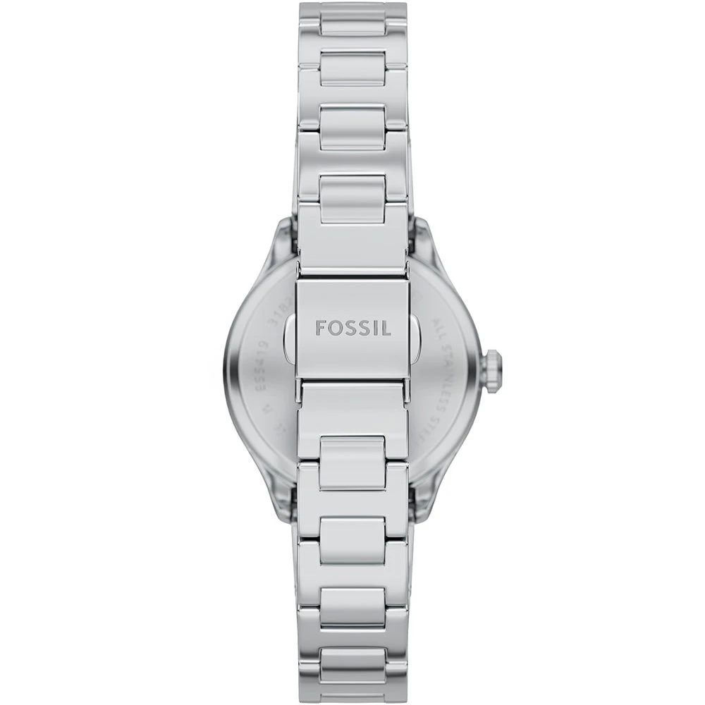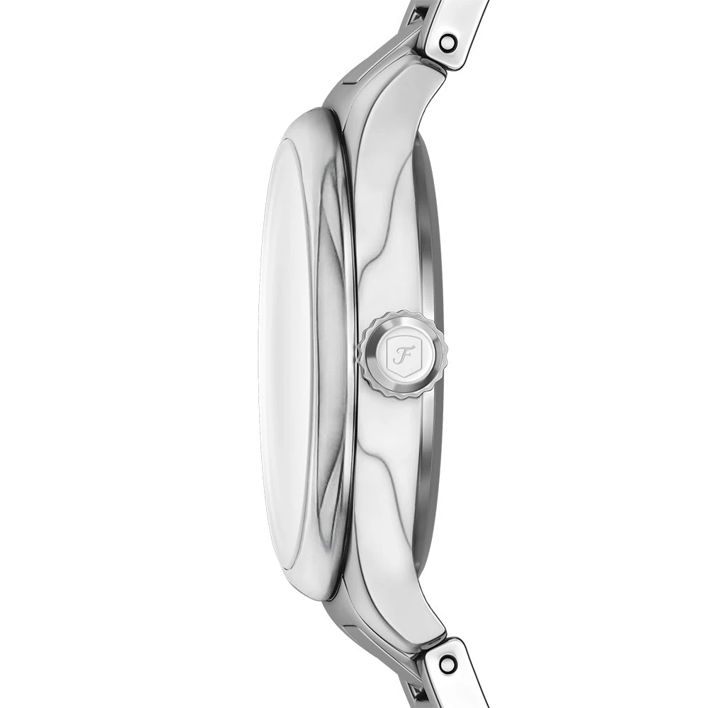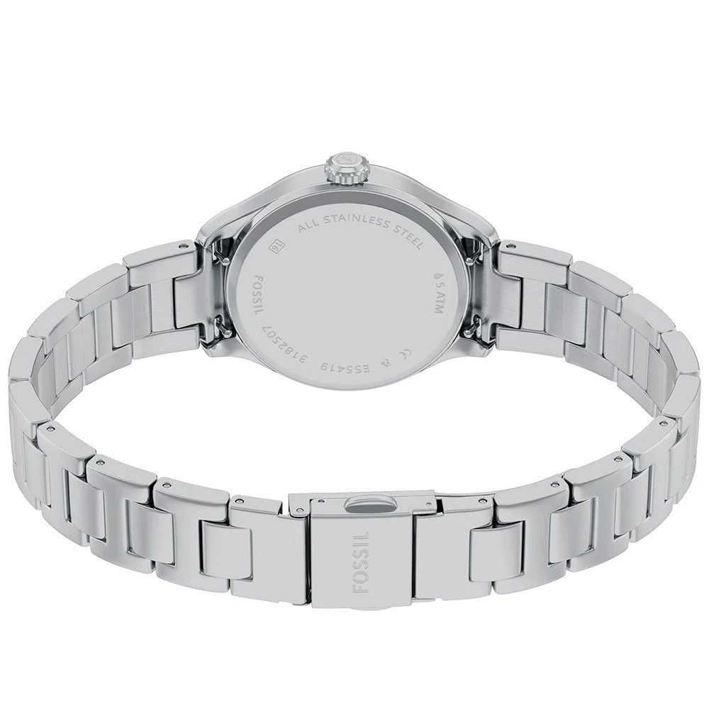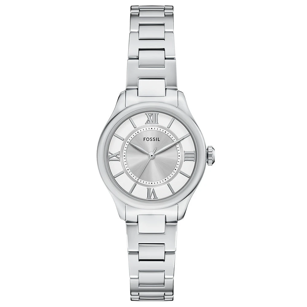 The Fossil Gilmore ES5419 features a sleek, all-silver design that embodies modern elegance. Its polished stainless steel round case and matching bracelet create a cohesive, refined look. The white and silver satin sunray dial offers subtle texture and minimalist detailing, emphasizing simplicity with a three-hand configuration. With thoughtful craftsmanship and a streamlined aesthetic, this 28mm timepiece is perfect for everyday sophistication.
