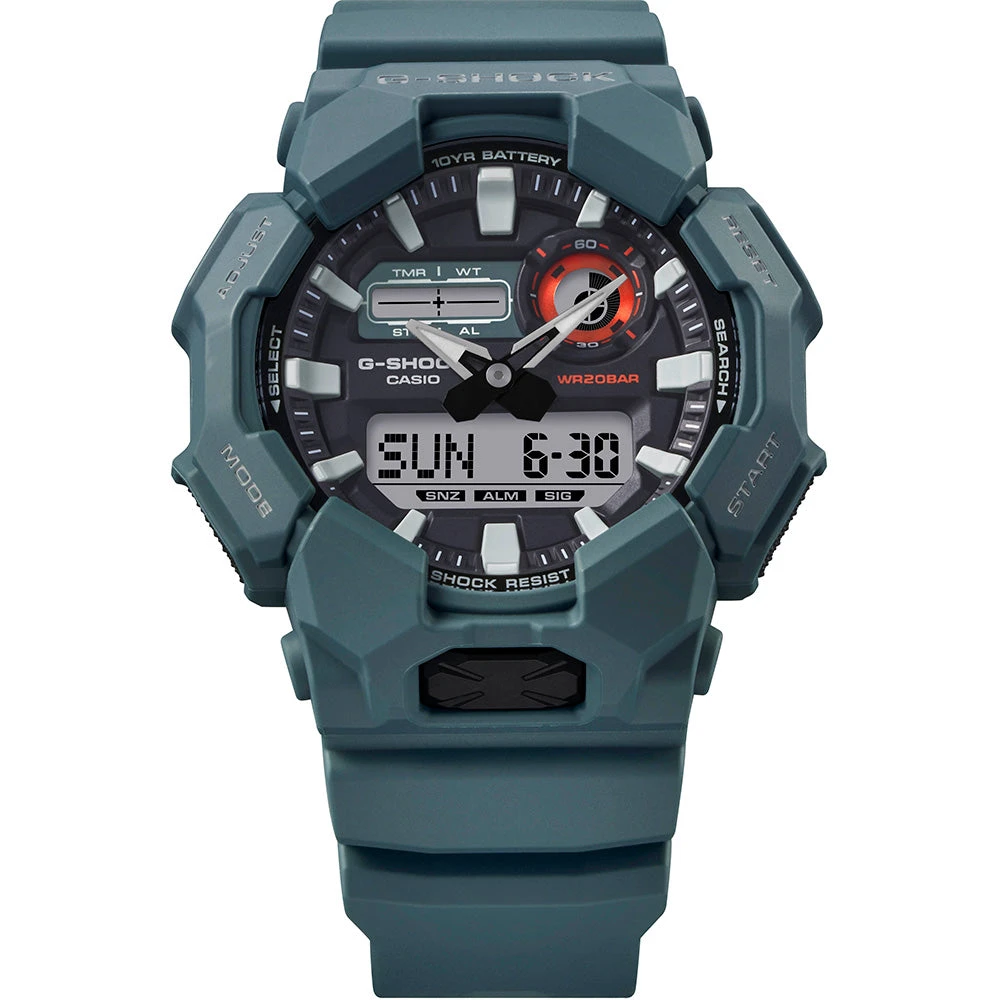 G-Shock GA010-2A Rugged Combo provides long-term reliability with a 10-year battery, minimizing the need for replacements. This analog-digital watch features world time and a stopwatch, along with a high-brightness LED light that’s easily accessible via a large front button for clear visibility in dark conditions. Constructed from bio-based resin, it’s an excellent choice for those looking to lower their environmental footprint.