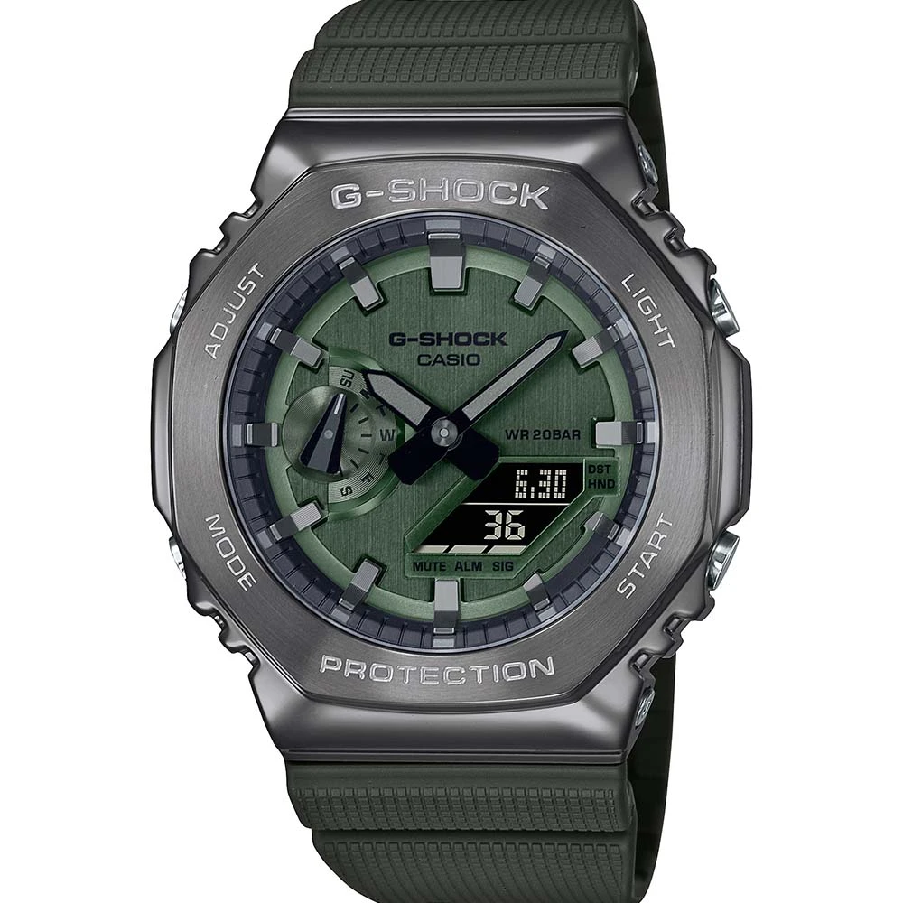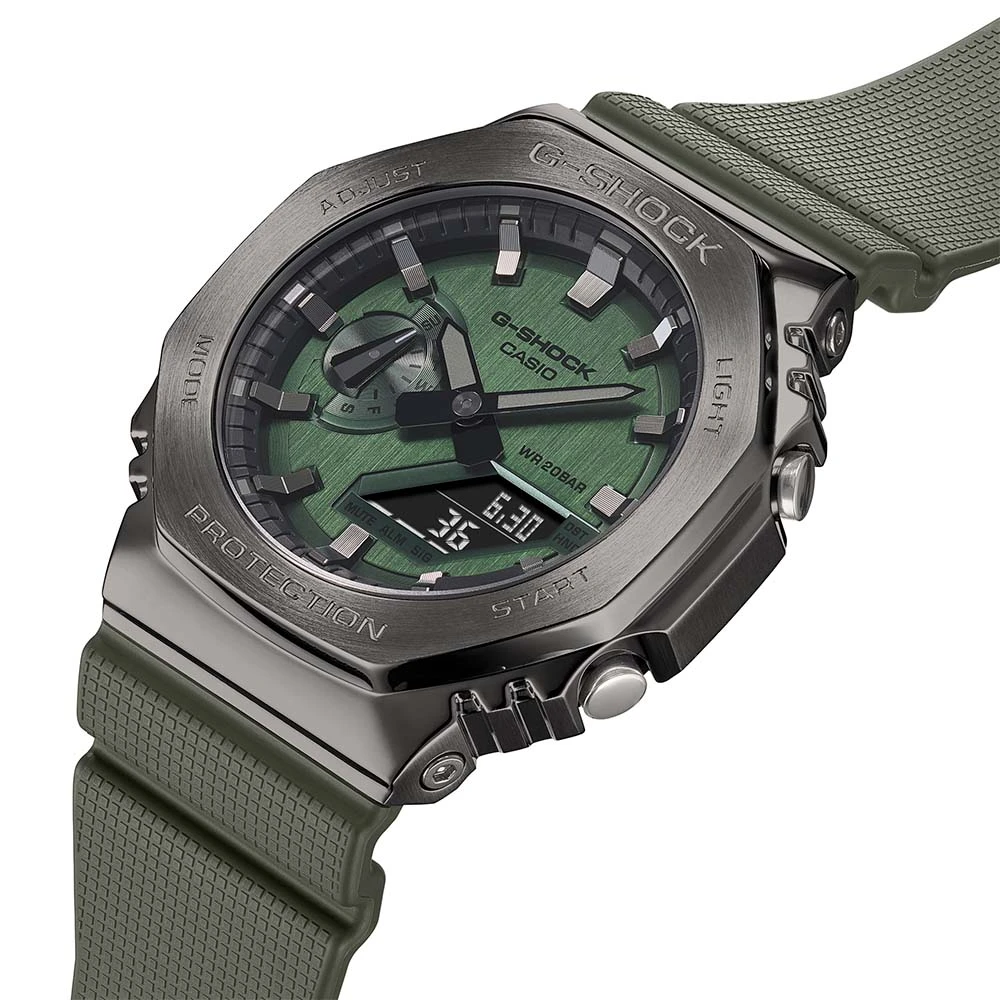 Meet the G-Shock GM2100B-3A Green Metal Covered ‘CasiOak’, a rugged timepiece that marries style with durability. Its compact 49.3 × 44.4 × 11.8mm case and 72g weight make it both resilient and comfortable for everyday wear. Crafted with a robust combination of resin and stainless steel for the case and bezel, paired with a reliable resin band, it’s designed to withstand shocks and maintain its integrity in any environment. With a water resistance of 200 meters and a battery life of approximately 3 years on SR726W X 2 batteries, it’s prepared for any adventure. Featuring mineral glass and an array of functions including world time, stopwatch, timer, and alarms, it ensures you’re always on schedule. The double LED light system guarantees clear visibility in any lighting condition, while the full auto-calendar keeps you organized up to the year 2099. Complete with a mute feature for button operation tone control and a hand shift feature for unobstructed viewing, the GM2100B-3A is the perfect blend of toughness and functionality.
