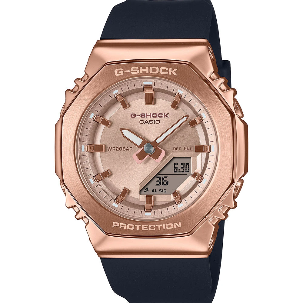 The G-Shock GMS2110PG-1A4 combines elegance and durability with its sleek rose gold tone case, rose gold sunray dial, and contrasting black strap. This stylish watch features a compact octagonal design, perfect for those with slender wrists, and is crafted with a metal dial for a refined texture and feel. The resin parts of the band are made from bio-based materials, promoting sustainability. Whether you’re dressing up or down, this model adds a sophisticated touch to any outfit.