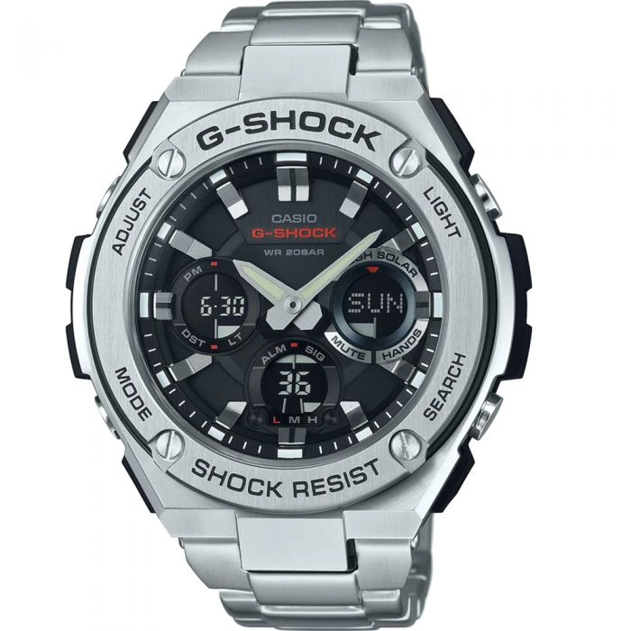 The G-Shock GSTS110D-1A G-Steel Solar World Time Watch, a rugged yet refined timepiece. With its robust case size of 59.1 × 52.4 × 16.1mm and weight of 195g, it’s built to withstand the demands of daily life. Crafted with a blend of resilient resin and stainless steel, it offers both durability and sophistication. Powered by Tough Solar technology, it ensures uninterrupted performance. Explore its features, including shock resistance, water resistance up to 200 meters, world time functionality, stopwatch, timer, and alarms. With its double LED light and full auto-calendar, it’s the perfect blend of functionality and style.