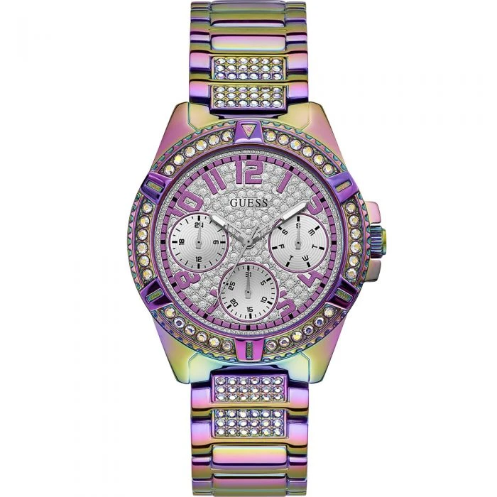 Flaunt your unique style with this captivating Guess Frontier Multi Colour Womens Watch. With speckles of metallic purple, green and blue and embellished with sparkly rhinestones, this timepiece is flattering, stylish and the ultimate statement piece.