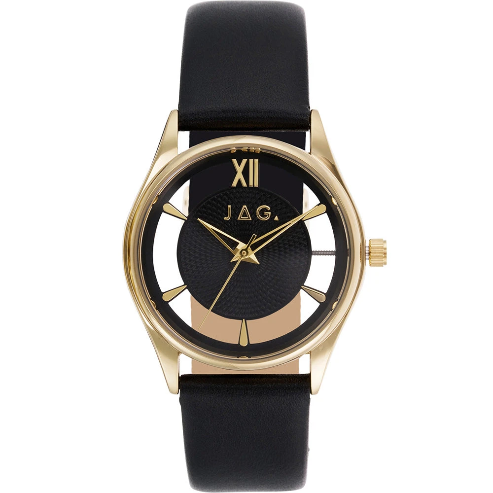 Sleek and minimal, the Jag Croydon J2926 features a 34mm gold-tone case contrasted by a bold black dial for a striking, modern look. The matching black strap with an 18mm band width adds to its refined and versatile style, perfect for day-to-night wear.