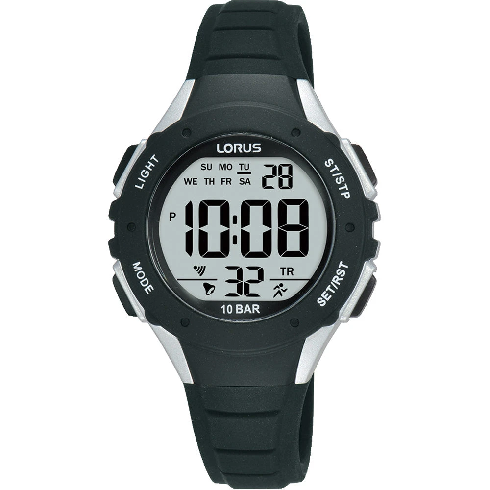 The Lorus R2361PX9 Digital watch combines practicality with a sleek design, featuring a black and silver case complemented by a comfortable black silicone strap. With a compact 32mm case size, it offers a stylish and ergonomic fit for daily wear. Powered by the Calibre Z013, this digital timepiece includes essential features such as a countdown timer capable of setting intervals up to 23 hours, 59 minutes, and 59 seconds, catering to various timing needs. The stopwatch function measures elapsed time precisely in 1/100th of a second increments, with split and lap capabilities enhancing its versatility for sports and daily activities. Crafted from a durable blend of plastic and stainless steel and protected by acrylic glass, it ensures resilience against daily wear and tear. Water resistant up to 100 meters, the Lorus R2361PX9 is designed to withstand water exposure and accompany you through both casual outings and active pursuits with reliability and modern style.