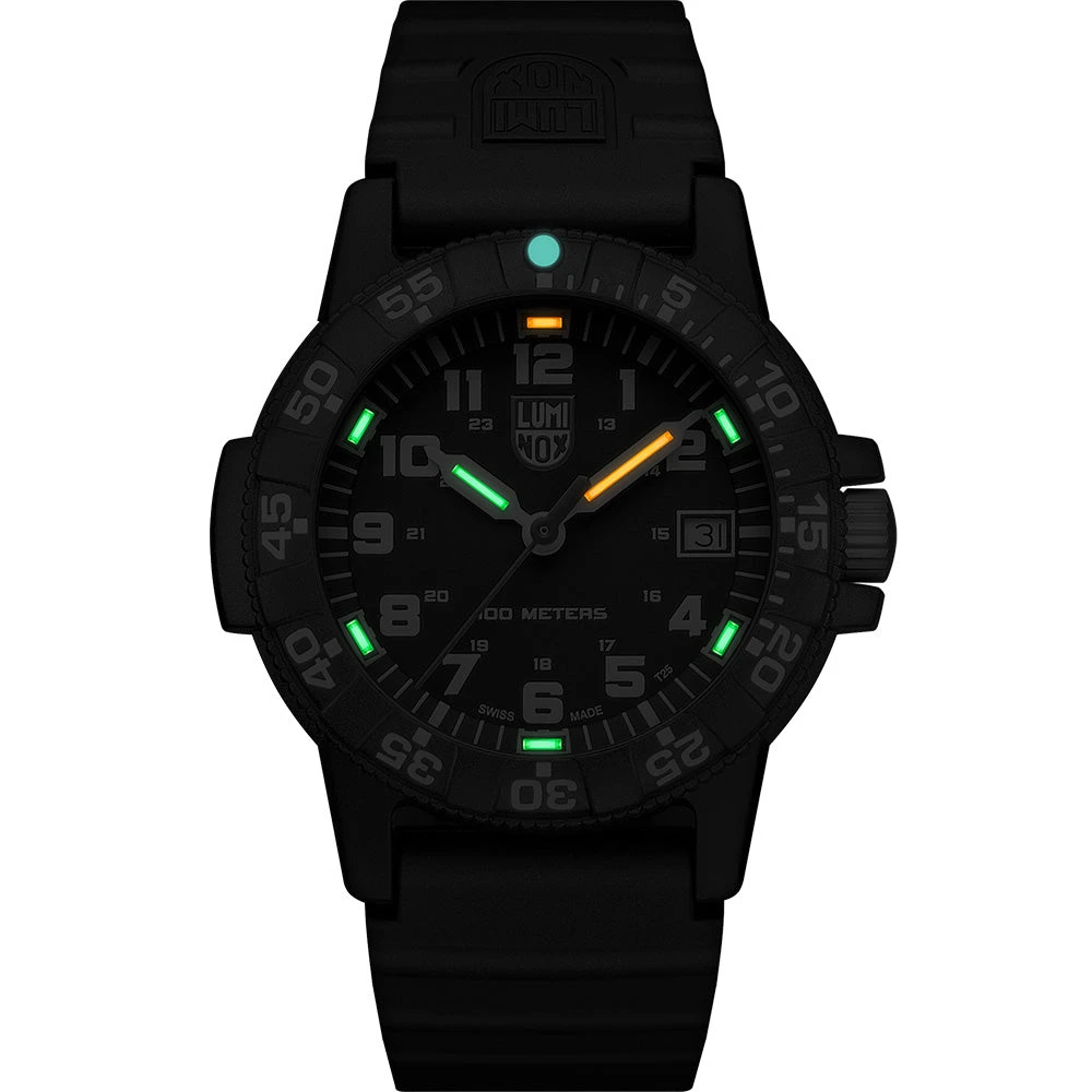 The Leatherback Sea Turtle showcases an impressive 39mm CARBONOXTM case and boasts water resistance up to 100 meters. Its black dial with white numerals ensures optimal readability during daylight hours, while the renowned Luminox Light Technology illuminates the dial at night, providing “Always Visible” self-powered illumination for up to 25 years.