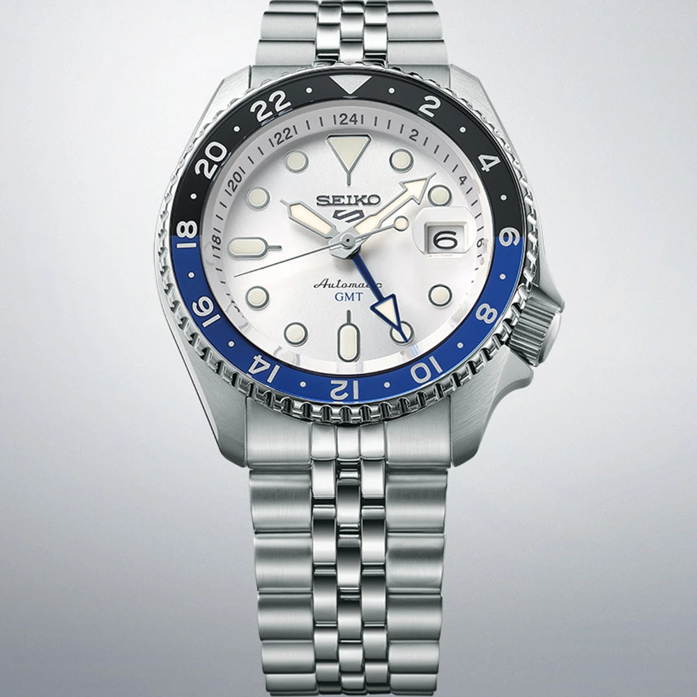 The Seiko 5 SSK033K SKX GMT offers a blend of classic design and robust functionality, perfect for those who appreciate both style and performance. Featuring a 42.5mm silver case and a sleek silver dial, this watch is complemented by a bold black and blue bezel, adding a sporty edge to its appearance. It is powered by the reliable Calibre 4R34 movement, ensuring accurate timekeeping. The Hardlex crystal with magnified glass provides enhanced visibility and durability, while the screw see-through case back reveals the intricate mechanics inside. With a water resistance of up to 100 meters, this timepiece is built to handle various conditions. The silver bracelet is secured with a three-fold clasp that includes a secure lock and push button release, offering both security and ease of use.