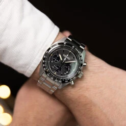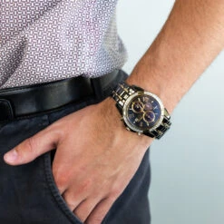The 34mm case and bracelet feature a refined two-tone finish of stainless steel and yellow gold plating, secured with a deployment clasp and push-button release. Powered by the Calibre 4R35 automatic movement, the inner workings can be admired through the exhibition case back, while 50-metre water resistance ensures everyday reliability.