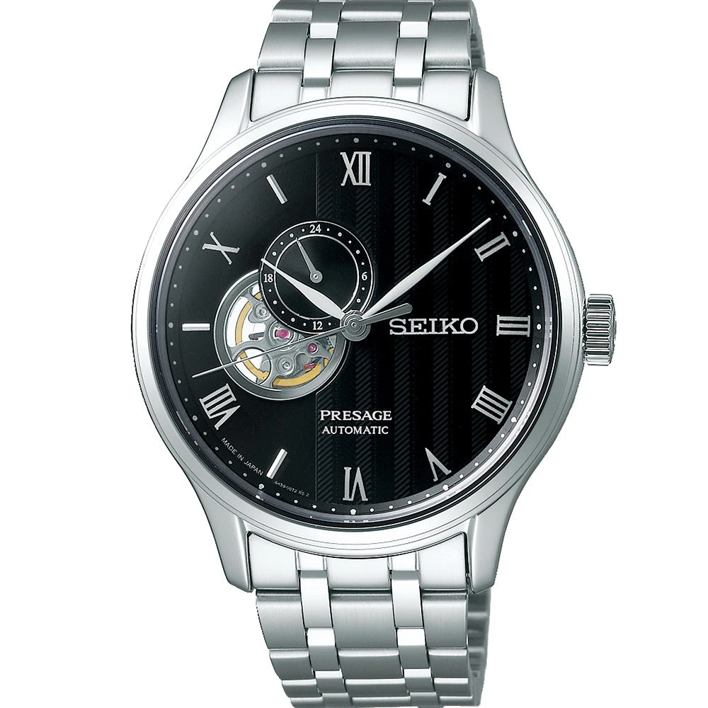 The Seiko “Garden” Presage automatic Men’s watch is an ideal choice for every occasion. Boasting a stainless-steel case paired with a black dial, it exudes timeless elegance. The classic dial design showcases a refined pattern and is adorned with silver Roman numeral markers for a sophisticated touch.