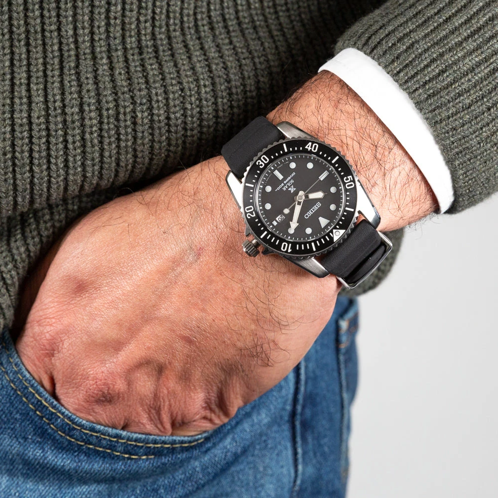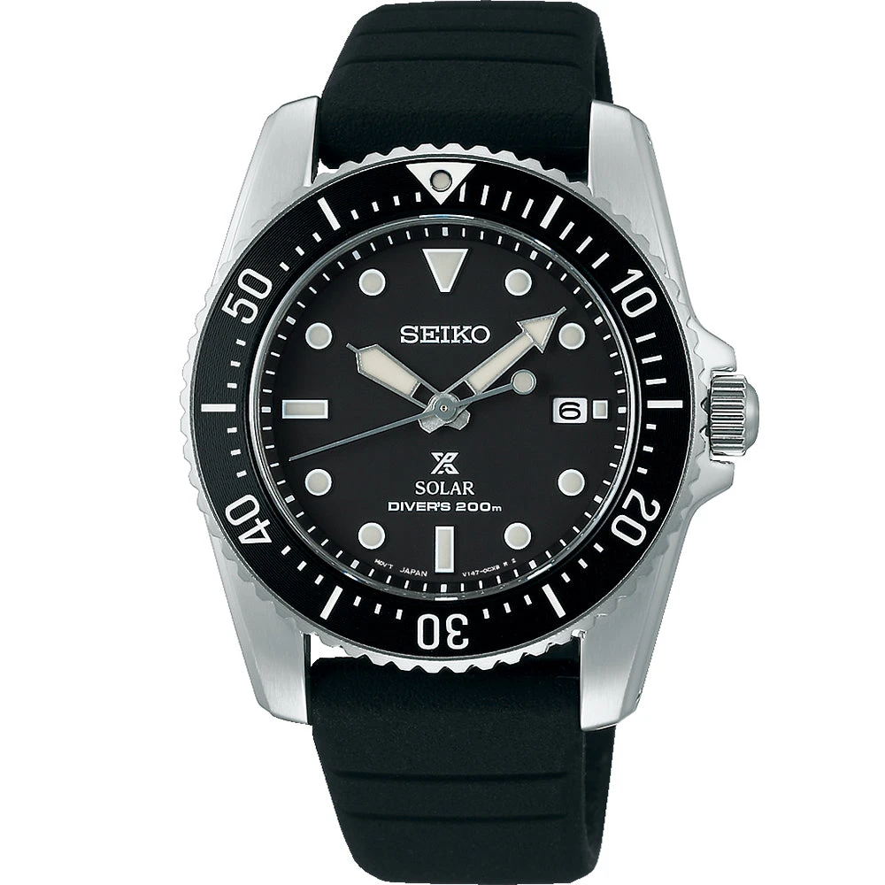 Dive deep with this sporty Seiko Prospex divers watch. Powered by solar, this stylish black Seiko is a technological powerhouse. Built to survive 200m of water pressure and backed by the most precise Japanese quartz movement. Designed with a high visibility dial and a rotating 60-second bezel for careful timekeeping when diving.