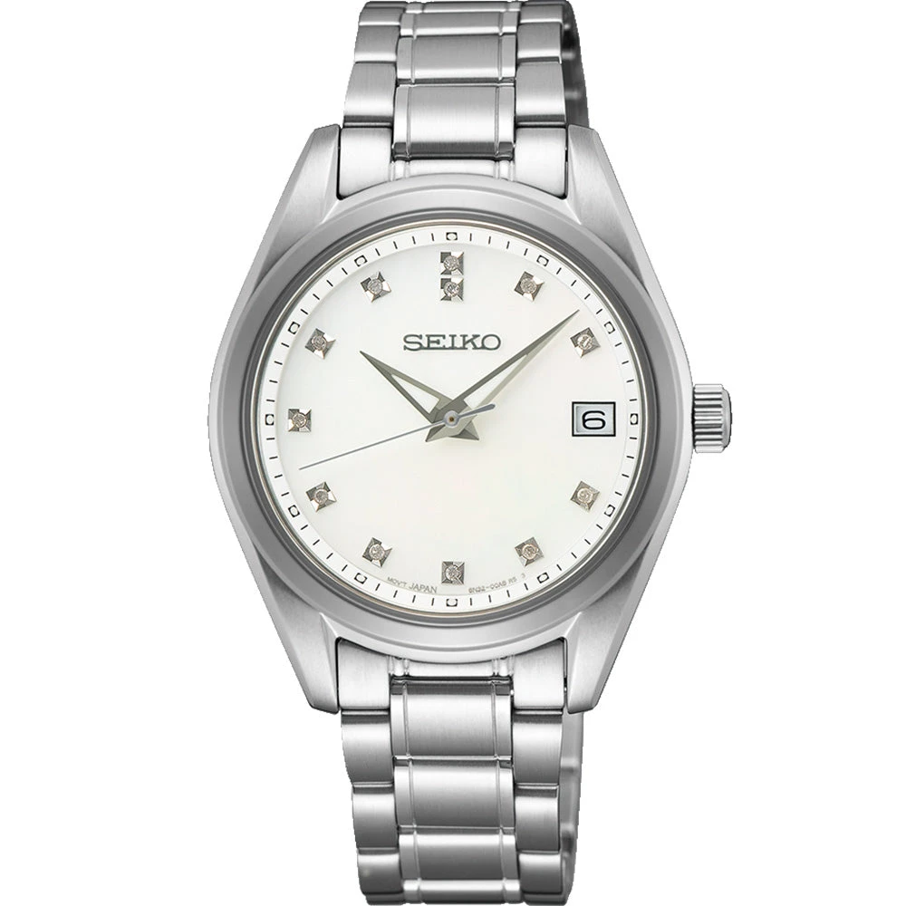 The Seiko SUR579P watch showcases a mother of pearl dial adorned with silver-toned diamond-set markers and hands featuring LumiBrite luminescence, along with a date window, all protected by scratch-resistant sapphire crystal glass. Its 32mm case and matching stainless-steel band exude a sleek and unified aesthetic.