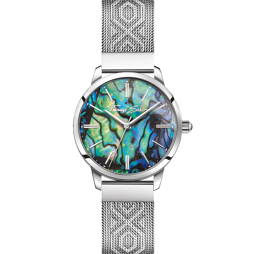 The Thomas Sabo TWA0344 Arizona offers timeless elegance in a compact 33mm case size. Its mesmerizing Abalone Mother of Pearl Dial brings a touch of nature’s beauty to your wrist, while the durable stainless-steel case and strap ensure lasting quality. With hardened mineral glass protecting the dial, this watch combines style and functionality seamlessly.